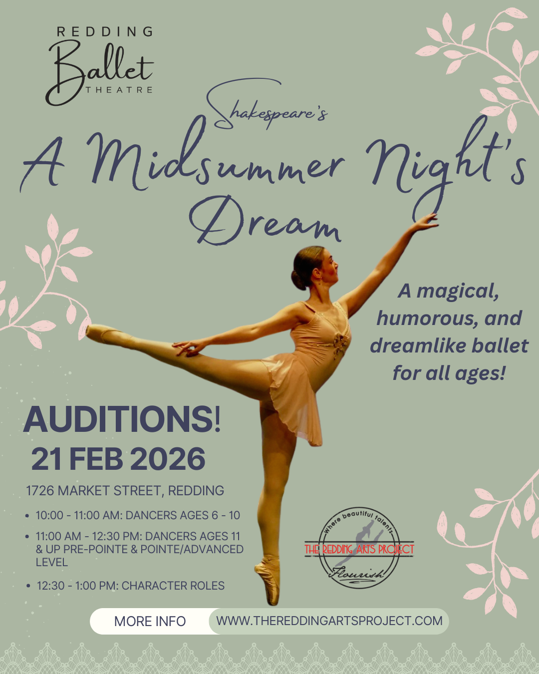 We embrace a learning environment that will prepare you for the path ahead. Our classes incorporate traditional learning styles as well as hands-on experiences and our class sizes are small to ensure that each student gets the attention they need. We have state-of-the-art raised floors with a professional Marley surface to protect our dancers from injury. We are conveniently located in charming downtown Redding in the Cultural Arts District surrounded by local restaurants and coffee shops and directly across the street from the historic Cascade Theatre.